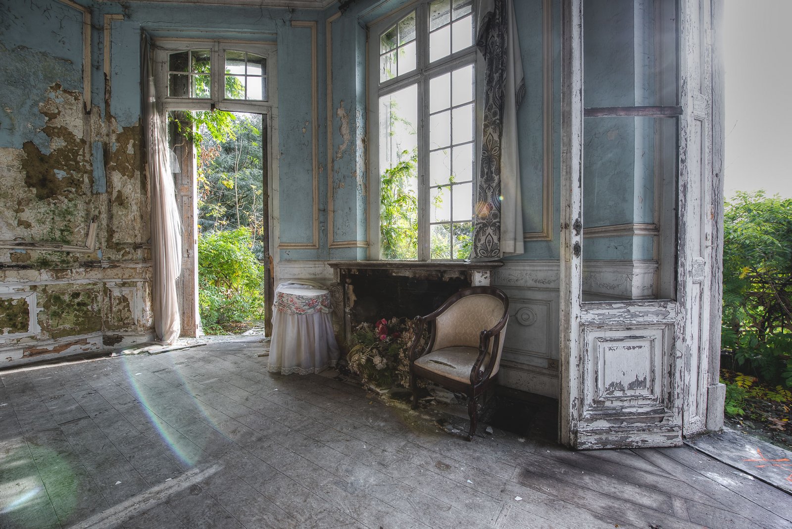 Ganz in der nähe der französischen Grenze liegt dieses Chateau, welches zuletzt von einem Backwarenhersteller und Starkoch als Hotel und Restaurant, welches überwiegend durch gut betuchte Bürger genutzt wurde. Das Chateau wird von Tag zu Tag eine immer größer werdende Touristen Attraktion. Am Tag unserer Tour, trafen wir ca 20-30 weitere Personen, unter anderem eine Hochzeitsgesellschaft, die hier mit Kindern durch die großen Säle, welche man einst für Feiern mieten konnte herum gesprungen sind, die im Chateau wohl ein Shooting geplant haben, als auch weitere Fotografen, die die selben Absichten wie wir verfolgten. Das Gelände selbst ist offen wie ein Scheunentor, was man an dem Andrang der Touristen erkennen kann. Ein interessierter Investor hatte nach langem Leerstand des Gebäudes Pläne geschmiedet, welche vorgesehen haben aus den alten Gemäuern ein frisch renoviertes luxuriöses Wellnesszentrum erstrahlen zu lassen. Jedoch hatte die Stadt andere Pläne vor und lehnte den Antrag des möglichen Investors ab. Mir persönlich war das zu viel Tohuwabohu, so dass ich SCHNELLSTENS das Gebäude wieder verlassen wollte. Tour mit Urbex Wetterau